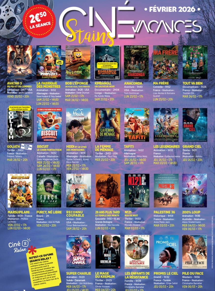 Comme à chaque période de congés scolaires, la Ville de Stains propose une programmation riche et accessible, avec des séances au tarif unique de 2,50 €